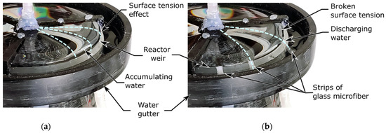 Water surface tension effect on the reactor weir. (a) Retained water volume before falling over the reactor weir; (b) Continuous water discharge over the reactor weir using glass microfiber strips.