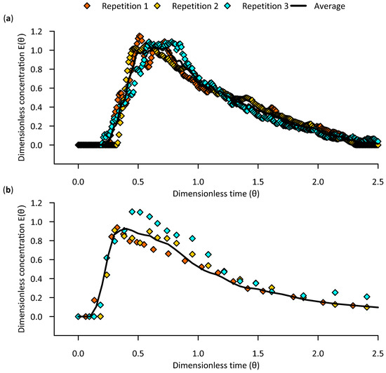The RTD curves obtained using the manual method (Figure 9b) have similar shapes to those obtained with the automated method. However, there is a clear reduction in the measurement’s frequency (i.e., fewer data points are obtained) in comparison to the automatic method, as the researcher quickly becomes saturated with the measurement tasks. Compared to the automatic method, a greater dispersion of the tracer measurements is found, especially around the tracer concentration peak (i.e., around ). This dispersion could indicate that, despite keeping the recommended conditions discussed in Section 3.1, more significant flow disturbances may have occurred during the manual operation of the reactor.