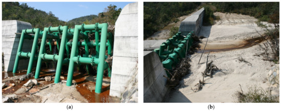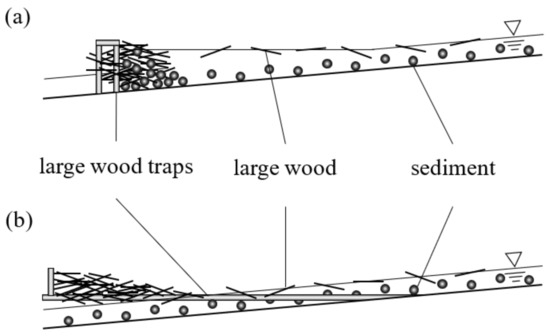 Of the various countermeasures employed, the most common are LW traps installed in streams, which directly capture LW. The capture efficiencies of grid-type check dams have been examined both experimentally, e.g., [14,15,16] and numerically, e.g., [17]. Additionally, backwater rises caused by LW blockages of ogee crest spillways have been investigated, e.g., [3,12]. In Japan, the Ministry of Land, Infrastructure, Transport, and Tourism has prepared guidelines for the installation of LW traps [18]; several such traps have recently been installed, e.g., [19,20]. In addition, certain grid-type check dams serve as LW traps. Most traps principally feature vertical columns and thus capture LW in the vertical plane. However, after a trap is blocked by LW, sediment is often then captured, and the total amounts of LW and sediment that can be captured are thus limited (Figure 2).