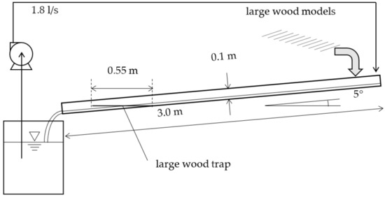 A schematic of the experimental setup is shown in Figure 4. The flume was rectangular in cross-section; it featured transparent acrylic side walls and a bed constructed using sandpapered wood. The flume was 3 m in length, 0.1 m in width, and 0.1 m in height; the bed slope was 0.087. For a stream of width 5–10 m, the experimental scale ranged from 1/100 to 1/50. A water tank was installed at the downstream end, and an electric pump (PX−650; Koshin Co. Ltd., Nagaokakyo, Kyoto Pref., Japan; maximum flow rate 4.3 L/s) continuously circulated water at 1.8 L/s. A conveyor belt (XCF-520G; SUS Corporation, Shizuoka, Shizuoka Pref., Japan) was operated at a constant speed (0.36 m/s) to feed LW units into the upstream end of the flume.