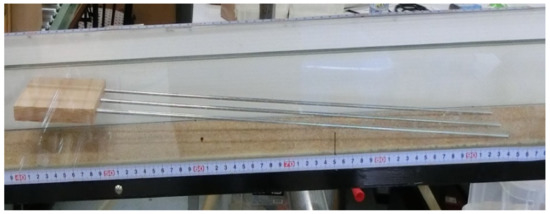 The LW trap featured aluminum rods, the ends of which were embedded in wood, and the trap was fixed in the channel at 0.3 m from the downstream end of the flume and 5 cm above the bed. The rods were horizontal. The trap in the flume is shown in Figure 5. The rods were 0.45 m in length and 4 mm in diameter, and the total length of the model (including the wood) was 0.55 m. We tested traps with three, four, and five rods. Figure 6 shows a top view of the trap. The rods were equally spaced (Sr values of 33, 25, and 20 mm; and wall-to-rod spacings of 17, 13, and 10 mm, when three, four, and five rods were used, respectively).