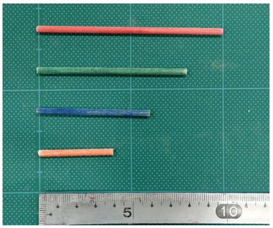 We employed simple cylinders (without roots and or branches) as LW units of four different lengths (Lw = 4, 6, 8, and 10 cm) (Figure 7). The LW was bamboo with a diameter of 3 mm. The density of wet LW was 0.97 g/cm3. The relative length of LW in terms of the rod spacing (Lw/Sr) may considerably influence trapping efficiency, as discussed below. The relative lengths of LW (the Lw/Sr vales) for each experimental condition are listed in Table 1. In each experiment, the LW length was uniform.