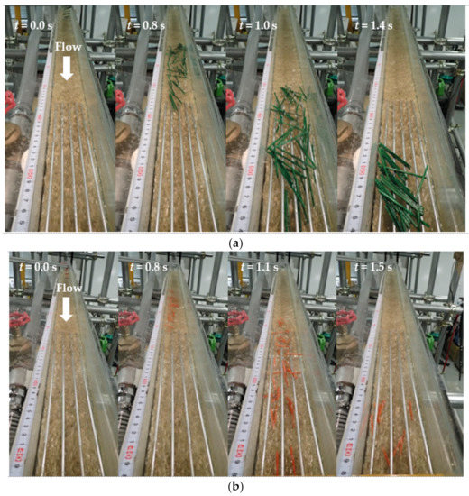 Figure 8a shows a series of photographs taken during the course of a typical experiment. The trap featured five rods, the LW length was 8 cm, the number of LW units was 50, and the supply rate (rw) was 180 s−1. LW was supplied upstream in the flume (t = 0.0 s), flowed down, and the first unit entered the trap at t = 0.8 s. Some units slipped between the rods and flowed away, but many were scooped up and captured (from t = 1.0 to 1.4 s). Conversely, an experiment in which the trap did not capture LW is shown in Figure 8b (another series of photographs). In this case, the trap featured four rods, the LW length was 4 cm, the number of LW units was 50, and the supply rate (rw) was 180 s−1. LW supplied upstream in the flume (t = 0.0 s) flowed down, and the first unit entered the trap at t = 0.8 s. Several units were scooped up by the rods, but they were not stably captured and were subsequently freed by the flow (at approximately t = 1.1 s). All LW units ultimately slipped between the rods and were carried away (t = 1.4 s). Thus, regardless of a consistent number of LW units (n) and supply rate (rw), trapping efficiency depended on the rod spacing (Sr) and the LW length.