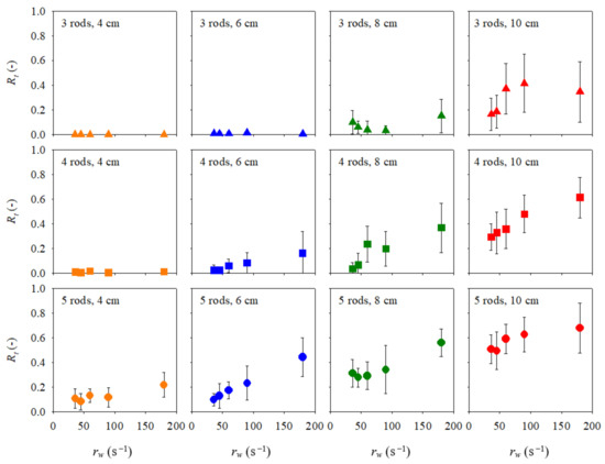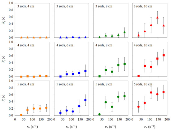 Figure 9 and Figure 10 show the relationships between the supply rate (rw) and the trapping rate (Rt) for each combination of rod number (three, four, and five) and LW length (Lw = 4, 6, 8, and 10 cm). The LW supply method differed between Figure 9 and Figure 10; Figure 9 shows the results with constant spacing, and Figure 10 shows the results with a constant number of LW units. In Figure 9 and Figure 10, the triangles, squares, and circles refer to three-, four-, and five-rod traps, respectively. Furthermore, the orange, blue, green, and red symbols refer to LW lengths of 4, 6, 8, and 10 cm, respectively; these were the colors of the LW units (Figure 7). The dots and bars are the means and standard deviations of the trapping rates of the 10 repeat experiments. Overall, Figure 9 shows that the trapping rate tended to increase as the rod number and LW length increased. For example, for Lw = 4 cm and three rods, the trapping rate (Rt) was 0, regardless of the supply rate. For Lw = 10 cm and five rods, the trapping rate (Rt) attained 0.6. For cases in which the trapping rate was not 0, the trapping rate generally tended to increase as the supply rate (rw) increased. However, several exceptions were observed, i.e., Rt decreased as the supply rate increased for Lw = 8 cm and four or five rods, for Lw = 10 cm and three, four, or five rods. We sought to explain these exceptions by checking the video recordings. We found no capture peculiarity and no unusual hydraulic conditions. Therefore, such exceptions may be due to the stochastic LW transport and accumulation process, and the exceptions do not affect the overall trend. In terms of trapping-rate variability, the standard deviation tended to increase as the trapping rate increased. However, when the trapping rate exceeded a certain value (Rt = 0.1 for Lw = 6 cm with five rods, Lw = 8 cm with four or five rods, and Lw = 10 cm with three, four, and five rods), the standard deviations and corresponding variability were similar. The trapping rates shown in Figure 10 exhibited similar tendencies to the trapping rates shown in Figure 9 for almost all cases but were slightly greater at lower supply rates rw for Lw = 10 cm. This was presumably because the number of supplied LW units (n) was smaller (minimum n = 10) as the supply rate (rw) diminished when the constant spacing method was used (Figure 9), whereas the number of supplied LW units (n) was consistent (n = 50) (regardless of changes in the supply rate rw) when the constant LW number method was used (Figure 10).