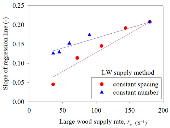 Since rw differs between Figure 11a,b except for the bottom and top figures, it is difficult to compare the dependence of Rt on Lw/Sr. Therefore, to demonstrate the different dependencies of Rt on Lw/Sr inherent in the two LW supply methods, the relationships between the slope of the regression line and the rw values are shown in Figure 12. When the supply methods are compared, the relationships between the rw values and the slope of the regression line clearly differ, not only for rw = 36 but also for 36 < rw < 150. The constant-number method features a larger slope. Therefore, the larger the number of LW units, the higher the trapping rate Rt even at the same Lw/Sr.