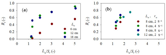 Figure 8, Figure 9 and Figure 10 show that the Lw/Sr value affected trapping efficiency. To emphasize this, the relationships for the two different LW supply methods are shown in Figure 11. In the figure, the relationships between Rt and Lw/Sr are shown separately for different supply rates (rw). The symbols refer to the numbers of rods and LW lengths are identical to those shown in Figure 9 and Figure 10. The standard deviation bars are omitted for simplicity. Because the supply rate (rw = 180 s−1) was consistent for both methods (n = 50 and lb = 50 cm), the figures for rw = 180 s−1 in Figure 11a,b are identical. All data points exhibit clear linear relationships, and the slopes of the approximating lines increase with an increasing supply rate (rw). However, the x-intercepts of the approximating lines are very similar (Lw/Sr = 1.5), regardless of the supply rate (rw). When the constant-spacing and LW-number-supply methods are compared, the slope of the regression line of the constant-spacing method is smaller than the corresponding line slope of the constant-LW-number method when rw = 36 s−1. This was because the number of supplied LW units (n) decreases (minimum n = 10) as the supply rate (rw) decreases using the constant-spacing method, whereas the number of supplied units (n) was always 50 (regardless of the reduction in the supply rate rw) when using the constant-LW-number method. Therefore, the relationship between the Lw/Sr value and the trapping rate (Rt) does not depend solely on the supply rate (rw); it also depends on the supplied LW number (n).