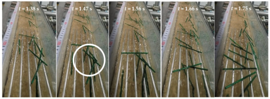 As mentioned in the Introduction, the main advantage of the new trap is that the horizontal rods scoop up and capture LW, separating it from water and sediment, thereby reducing trap clogging. We supplied sediment and LW simultaneously under certain conditions (average sediment diameter 5 mm, volume of sediment 180 cm3 (without the void), Lw = 10 cm, n = 50, rw = 180 s−1). Figure 15 shows a series of photographs taken during the course of the experiment. LW was captured by the horizontal rods, and the sediment flowed through the trap. The trapping rate (Rt) was 0.67, thus the same as when only LW was supplied (Figure 9 and Figure 10). Thus, even if the sediment diameter (5 mm) is larger than that of the LW (3 mm), it is not captured by the trap if the diameter is smaller than the rod spacing (Sr) (20 mm). However, more experiments are required because we only tested simple cylindrical shaped LW with uniform length, which is just a fraction of the natural LW mixture. We do not yet know whether the results of this study will be replicated when sediment is supplied with LW under various conditions. Furthermore, quantitative data on sediment separation from LW are required.
