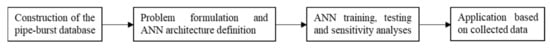 A novel approach to locate and quantify pipe bursts in water distribution networks, based on the use of ANN, is proposed and described herein. The methodology is a four–step procedure (Figure 1): (1) pipe–burst database construction; (2) problem formulation and ANN architecture definition; (3) ANN training, testing and sensitivity analyses; (4) application based on collected data. These steps are explained in detail in the following sections.