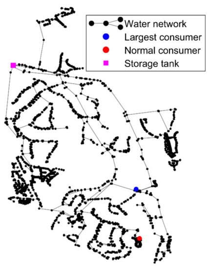 The case study is a water distribution system located in a highly touristic region in the South of Portugal (Quinta do Lago), managed by the water utility InfraQuinta (Figure 2). The WDS supplies approximately 1.7 mm3/year (2018), varying from 2000 to 14,000 inhabitants in winter and summer, respectively, with a relevant seasonality variation in what concerns to water demands. The supplied area has 7.5 km2 and consists mainly of houses/dwellings with swimming pools and irrigated gardens, hotels and some golf courses. Due to the seasonal variation in water demand as well as the increasing scarcity of water in this region year after year, the water utility has installed telemetry at the consumer level, with hourly consumption data for the ca. 2000 consumers, allowing efficient water–use monitoring, especially in the irrigation systems. The network has an approximate length of 77 km with pipes mainly made of asbestos cement and PVC and diameters between 32 and 362 mm. The network hydraulic model has 4448 nodes and 4494 pipes. The network is supplied by one storage tank and four pumping stations located inside the storage tank premises, set to operate at constant pressure during the day. These pumping stations are simulated in the hydraulic model EPANET as constant level storage tanks. Table 1 summarizes the main characteristics of the WDS. Figure 2 presents the analyzed WDS with the location of the existing storage tank and of two consumers: the largest consumer and a small house hold consumer whose daily consumptions are depicted in Figure 3. The largest consumers of the network are hotels and golf courses.