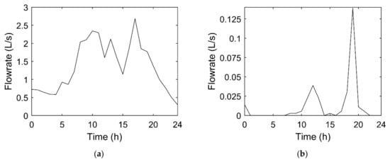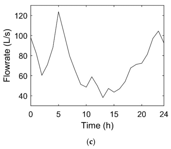 The daily flowrate variation of the largest consumer (located in node 8, highlighted in blue in Figure 2) and of a normal household consumer (located in node 1020, highlighted in red in Figure 2) is presented in Figure 3. Major differences are observed in the daily demand patterns of these consumers. The large consumer (a hotel) shows a minimum night consumption, possibly associated with water–night–uses or leakages in the private network, and two consumption peaks during the day, in the morning at 10 a.m. and in the late afternoon at 6 p.m. (Figure 3a). The individual consumer has also the same two peaks but has hardly any consumption during the remaining time, showing that the users might not be at home during the day (Figure 3b). The average flowrate at the inlet of the WDS is ca. 70 L/s, this being the respective daily variation between 40 and 120 L/s as presented in Figure 3c. A consumption peak at 5 a.m. is probably due to the irrigation of gardens.