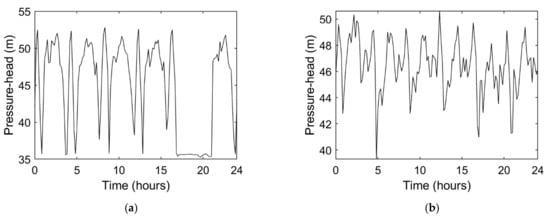 Figure 4 depicts examples of the daily pressure–head time series at two different locations for the scenario corresponding to the burst mean flowrate 25 L/s, located at node 2812, starting at 17 h. Comparing both graphs, Figure 4a shows a clear pressure–head drop at 17 h, whereas, in Figure 4b, the pressure–head hardly shows any variation caused by the burst (the burst effect does not reach the pressure head at the node); this is because the burst occurred closer to the former node (node 1000) than to the latter (node 2000). These graphs highlight the importance of having pressure–head sensors uniformly distributed throughout the WDS, so that bursts located at any node can be captured by, at least, one sensor. The location of these nodes (nodes 1000, 2000 and 2812) is presented in Figure 5a.