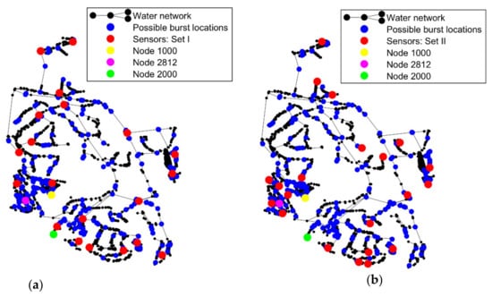 Water distribution network: possible burst locations and pressure sensors’ location: (a) Set I – reference location of sensors and (b) Set II.