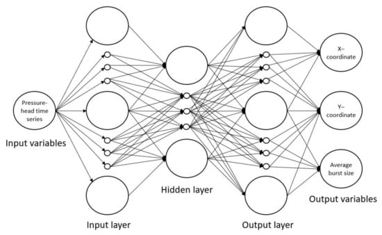 The problem formulation requires the establishment of the input and output variables of the ANN. After preliminary tests in which several combinations of variables of the ANN are analyzed, the configuration with the best results is the one in which the input variables are the pressure–head time series at the 21 sensors corresponding to Set I and the output variables are the node location described by the Cartesian X and Y coordinates and the average burst discharge.