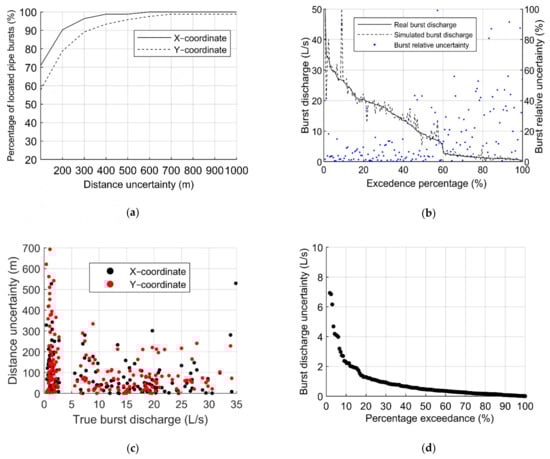 Results from the reference ANN: (a) percentage of located pipe burst as a function of the coordinates X and Y; (b) burst discharge distribution and the respective uncertainty; (c) distance uncertainty as a function of the simulated burst discharge; (d) burst discharge uncertainties.