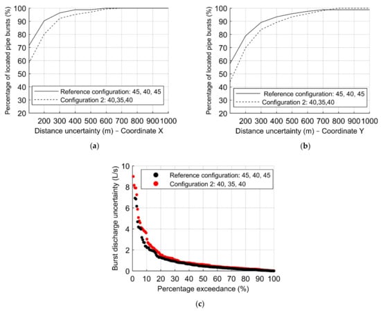 Obtained results from the testing phase of the ANN configuration (40, 35, 40) are compared with those from the reference configuration in Figure 8, in terms of the percentage of located bursts for each distance uncertainty in X and Y directions (i.e., distance between the estimated burst location and the real one). Both ANN have been trained with the same number of burst scenarios (1656) and the same set of sensors (Set I). Figure 8a,b depicts the distance uncertainties of the X and Y–coordinate. Figure 8c represents the percentage exceedance associated with the absolute error in the burst discharge (i.e., the difference between the estimated size of the burst and its real size).