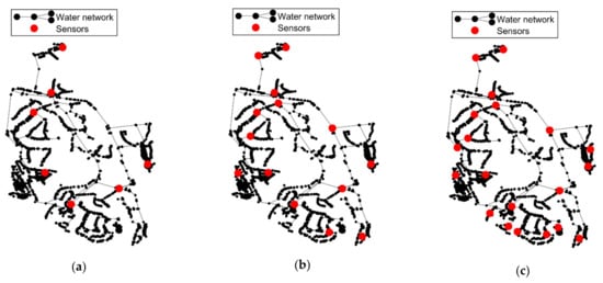 The analysis of the effect of the number of sensors on leak location is carried out herein. For this purpose, the Set I of sensors is divided into three groups comprised of 7, 14 and 21 sensors, equally distributed in the network. Once again, the reference configuration is used as a basis to carry out this analysis. Figure 9 presents the location of the three groups of sensors in the WDS.