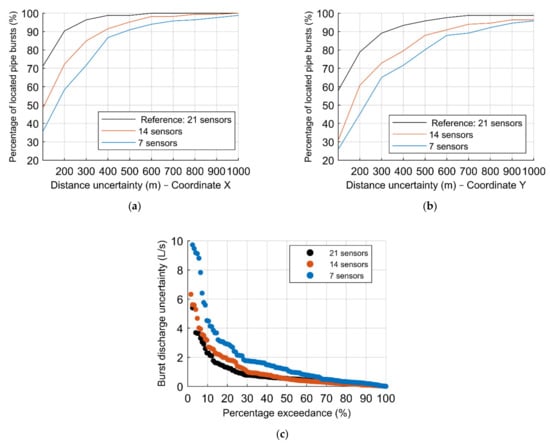 Considering an even smaller database, there is a more evident reduction of well–located pipe bursts for the smaller groups of sensors, especially when considering higher precisions, i.e., smaller distances, for both X and Y coordinates (Figure 13a,b). For the minimum distance of 100 m in the X coordinate, there is a reduction on the percentage of located pipe bursts of 10% and 20%, comparing to the reference group of 21 sensors with 14 and 7 sensors, respectively; considering the Y coordinate, the reduction in the percentage of located pipe bursts is 20% and 30%. The importance of the number of sensors is also visible in quantifying the burst discharge, as the reference group presents the lower burst discharge uncertainties, depicted in Figure 13c.