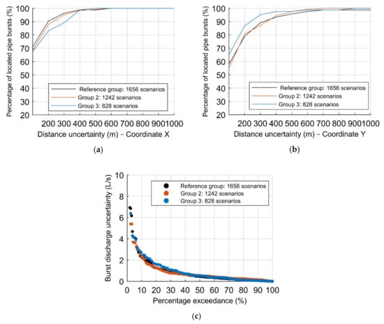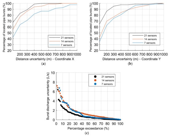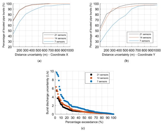 In addition, Figure 13 depicts the results of the simulations to assess the effect of the number of sensors to the third group of scenarios, composed of 828 burst scenarios, with the percentage of located pipe bursts according to the distance uncertainty of the (a) X and (b) Y–coordinates, respectively, comparing the hit percentage results between the multiple groups of sensors, and the (c) percentage exceedance associated with the absolute error in the burst discharge. The reference ANN configuration is used in all three graphs.