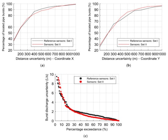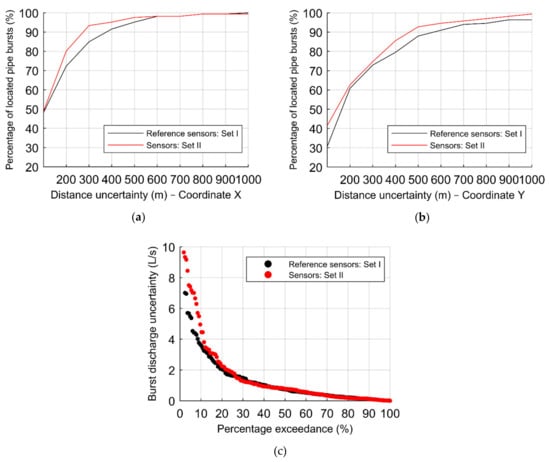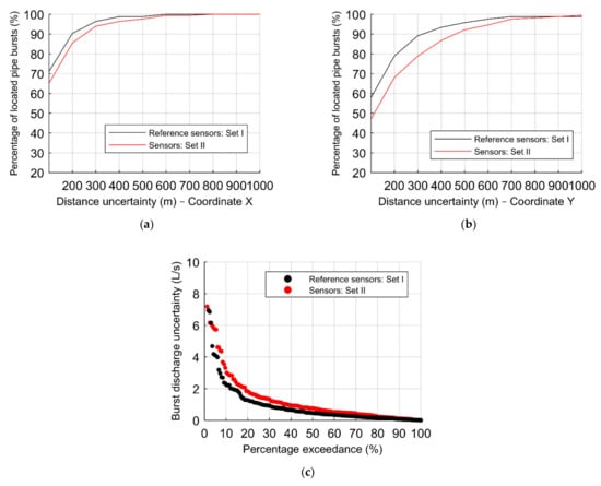 To conclude the assessment of the effect of considering a different set of sensors, the same analysis is carried out for 7 sensors. Figure 17 depicts the results of both sets, considering the reference configuration and the 1st group of scenarios, composed of 1656 burst scenarios, with the percentage of located pipe bursts according to the distance uncertainties of the (a) X–coordinate, and (b) Y–coordinate, and the (c) percentage exceedance associated with the absolute error in the burst discharge.
