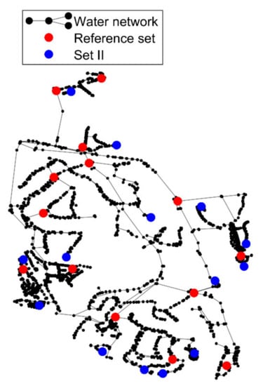 At a second stage, a sensitivity analysis is carried out to assess the effect of the number of sensors and their location on the success and accuracy of burst location and quantification. Thus, a second set of sensors (Set II) is analyzed; Figure 5b depicts the location of the Set II sensors.