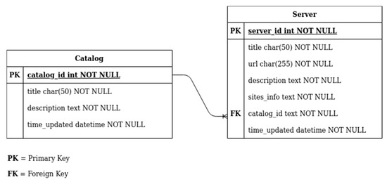 General discovery at the WDE Catalog level stores the following metadata: (i) name, (ii) description, and (iii) URL of the WaterOneFlow web services. The metadata stored from the general discovery consists of: (i) site names, (ii) site codes, (iii) site geospatial locations, and (iv) site network. WDE stores a local copy of these metadata in the Tethys PostgreSQL database. These data are stored in one database using two tables: one for different WDE catalogs, and the other for servers, as shown in Figure 3. Storing data in the local database allows WDE to quickly access and present data that have already been discovered so that discovery does not occur each time WDE is run, which can be time consuming and place undue loads on the servers. For example, for the CUAHSI HIS system, the Server table contains all the metadata for each site on the server which is retrieved using the GetSites method. For the WHOS system, the Server table contains the metadata for each site associated with any from the different WHOS custom views. Similarly, the Catalog table contains metadata for each catalog retrieved using the GetWaterOneFlowServicesInfo method to a HIS Central catalog (CUAHSI HIS) or a WHOS customized view.