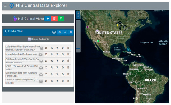 In the WHOS Views case study, WDE discovered the transboundary and countries WaterOneFlow web services and their available web services, as shown in Figure 5. In the HIS Central case study, WDE did not discover all the WaterOneFlow web services from the HIS Central catalog because some contain large amounts of data, such as with the NWIS daily values. NWIS Unit values are available through WaterOneFlow web services from the U.S. Geological Survey (USGS) that slow down performance because of their size. Therefore, we designed the HIS Central customized WDE to only discover six WaterOneFlow web services without a specific selection criterion, as depicted in Figure 6.