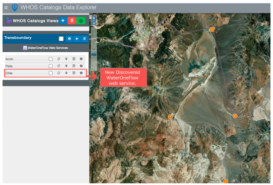 The WDE homepage presents a base map without any sites. This view allows the user to turn off or on the display of the different sites found using the WDE Catalog and server-level discovery methods. For the HIS Central case study, WDE performed general data discovery in the HIS Central catalog for any sites in the selected regions. In the WHOS Catalogs case study, it performed general data discovery in both the transboundary regions and the data provider countries catalog. For both case studies, the general discovery created a WDE catalog in the WDE database. After general data discovery, WDE displayed the retrieved data in the WDE catalog list.
