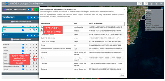 To demonstrate general discovery at the server level, for the WHOS Catalogs case study we used the Humedales Ramsar Atacama WaterOneFlow web service registered at CUAHSI HIS Central. Figure 8 shows the results of the server general discovery. For the WHOS Catalog case study, WDE conducted variable discovery for the WaterOneFlow web service at the “Plata” server in the Transboundary catalog, with the results shown in Figure 9. The metadata from the different variables belonging to the La Plata WaterOneFlow web service are displayed in a table containing variable name, measurements units, and WHOS variable code.