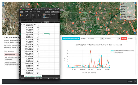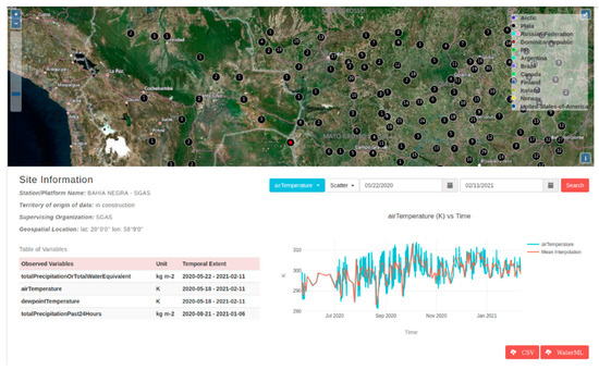 In the second instance, we demonstrated time series data visualization. Figure 12 shows the download of a CSV file associated with the Plata server from the WHOS Catalog case study. A plot of the data can be seen in the WDE screenshot. For this demonstration, we downloaded the total precipitation data for the Mariscal Estigarribia site. We saved the data in a CSV format; the WaterML format is also available but was not used here.