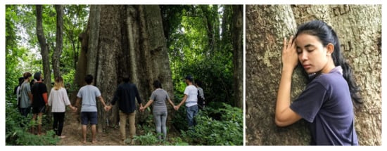 In 2017, YEA founded a program called Der Prey (“Forest Trekking” in Khmer) to help urban Cambodians experience nature and learn how local people and conservationists work to protect the country’s landscapes. The program’s founders had previously worked with nongovernmental organizations that funded such trips to bring people to conservation sites. The Der Prey model makes the opportunity accessible to anyone with an interest and ability to cover their costs, which average about USD 100 per person. Since its founding, the group has taken more than 2000 Cambodian students, business owners, and corporate staff between the ages of 16 and 35 on more than 30 immersive nature experiences. These have included trips to the evergreen forests of the Cardamom Mountains, the wetlands of Tonle Sap Lake and the Mekong River, the dry forests of the Eastern Plains Landscape, and the central lowland forest in the Prey Lang Wildlife Sanctuary. The trips may involve tours or talks from community members to learn how local livelihoods depend on natural resources, such as fishing, harvesting plants, or gathering wild honey. Participants are introduced to topics such as the history of protected areas, law enforcement and conservation practices, local beliefs, and traditional knowledge about plants and wildlife. Other activities include nature walks, reflections, and discussions among participants about their connection to nature (Figure 2).