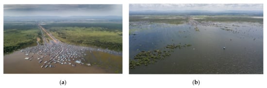 Two pictures of the Kampong Luong floating village in Pursat Province on Tonle Sap Lake by photographer Suthep Kritsanavarin shared on WOM social media. (a) Photo taken in June at the beginning of the rainy season; (b) photo taken in September. On average, the village moves back as far as three kilometers during the rainy season.