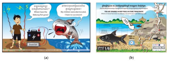 Popular posts included both positive stories, such as the release of endangered juvenile fish from captive rearing ponds, as well as negative stories about the threats of trash, deforestation, and the poaching of waterbirds (Table 4). Several stories had explicit conservation messages, such as a popular cartoon communicating the harms of illegal electrofishing practices (Figure 5, Table 4). Technical profiles about various fish species that included identifying characteristics and notes on biology, habitats, and threats were well received, reflecting an interest among Cambodians in learning about their local aquatic biodiversity. The most popular of these was a post about the tinfoil barb (Barbonymus schwanenfeldii), a relatively common Mekong fish that is popular with aquarists, which had an organic reach of 12,952, and 2112 engagements. Longer content was sometimes split into multiple posts in a series. For instance, a series of infographics was shared about the life cycle of the giant barb (Figure 5). In this case, the first post in the six-part series was most popular, perhaps because it was the most novel. Releasing posts in series or around themes, such as Earth Day, also helped boost engagement. Effort was made to translate all posts into Khmer and English. While time-consuming, this helped increase engagement among the primary audience of Cambodians. As many of the comments and questions on the page were posted in Khmer, bilingual moderators were needed to engage with the audience.
