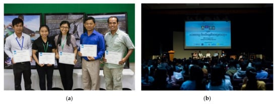 In June 2019, YEA hosted an outreach event as a culmination of an engagement campaign called the Mekong Generation, which drew more than 1000 participants from schools, conservation organizations, donors, and Cambodian ministries. The event included booth exhibits from local conservation organizations, and showcased awareness-raising materials developed by the Mekong Generation participants, such as storybooks, games, and artwork. This was followed by a conservation career panel discussion, and the event finale included two musical performances. YEA worked with the traditional Cambodian dance group Mascot Cambodia and Arts to tell the story of an Irrawaddy river dolphin (Orcaella brevirostris) inspired by a Cambodian folktale (Figure 1a). This partnership supports the revival of Cambodia’s traditional artforms while also highlighting environmental issues faced by the endangered dolphins, such as the threat of entanglement in fishing gear. Using artistic approaches such as music and dance to introduce scientific or environmental concepts can produce memorable messages that resonate on an emotional level [66]. YEA also collaborated with the popular musical group SmallWorld SmallBand to write a song about the Mekong River, which drew enthusiasm from the young audience. Celebrity endorsements around conservation topics are a popular marketing strategy in Asia, although their effectiveness has yet to be empirically evaluated [67].