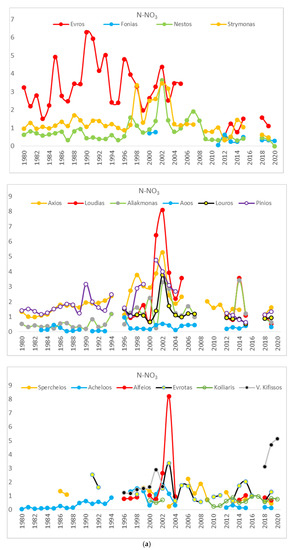 Besides the Evros, which suffered from severe nitrate contamination as early as in the mid-1980s, reaching its maxima in the early 1990s, the vast majority of the rivers presented nitrate peaks in the early 2000s (Figure 2a). During the last decade, all rivers showed lower nitrate concentrations than in the previous decades, except of V. Kifissos.