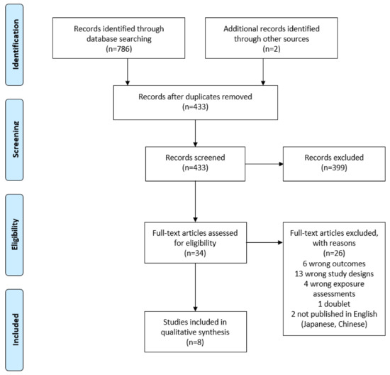 The total number of potentially relevant studies found through database and bibliography searches was 786 (see Figure 1). All relevant studies were obtained and accounted for. Eight studies were deemed eligible for inclusion in the systematic review.