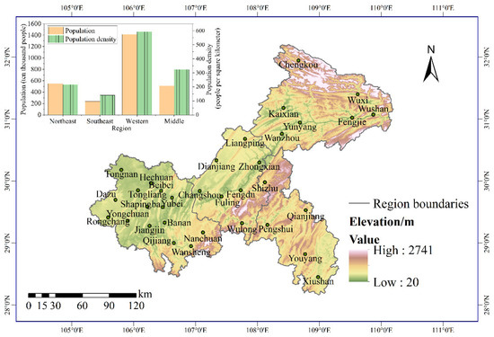 The main urban area of Chongqing is located in the western region, with a large population and high population density (Figure 1). With the continuous improvement of industries in the western region, the population flows into Bishan, Jiangjin, Yongchuan, and other districts around the main urban area, increasing water vulnerability. Moreover, the duration and severity of persistent, long persistent, severe, and extreme drought events in the western region increased insignificantly from 1960 to 2015. Urban water supply projects need to consider coping with these variations. There are many mountainous areas in the northeast region of Chongqing, and the population and population density are moderate (Figure 1). When planning the construction scale of rural drinking water projects in mountainous areas, the evolution of the duration and severity of meteorological drought events in the northeast region should be considered.