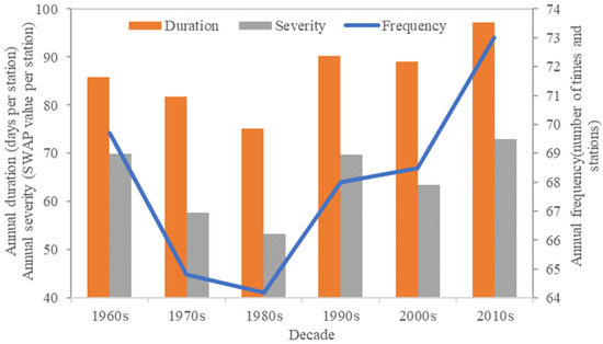 The decadal variation of drought characteristics is highlighted in Figure 3. The annual duration, severity, and frequency decreased to a valley in the 1980s, and then climbed again until 2010s. During the recent half-decade 2010–2015, the annual duration was 97 days per station, the annual severity reached 73 SWAP value per station, and the frequency of ordinary drought events rose to 73 times and stations.