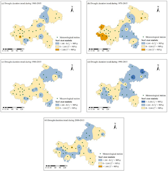 Figure 4a–e reflect the spatial distribution of trends in drought duration of ordinary drought events from 1960–2015 to 2000–2015 in Chongqing based on Sen’s trend test. The meteorological stations under significant positive trends were 8.8% for duration in the complete 1960 to 2015 period, concentrated in the western region (Figure 4a). There was an overall rise in the duration, but most of them failed the significance test, with the average trend test statistic 0.57. From 1970 to 2015, the middle and southeast regions showed a gradual decrease in the duration and the western region affected by the significant positive trend became more concentrated than the whole period (Figure 4b). The decrease was mainly concentrated in the northeast region from 1980 to 2015 (Figure 4c), while from 1990 to 2015, the decline in the northeast region passed the significance test and most areas of the city showed a decreasing trend, with an average trend test statistic of −0.16. From 2000 to 2015, there was no significant variation in the duration. The duration in the southeast and middle regions increased slightly, and the areas of the remaining regions that increased and decreased were roughly the same.