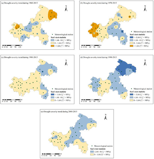 Spatial distribution of trend evolution of annual drought severity for (a) 1960–2015, (b) 1970–2015, (c) 1980–2015, (d) 1990–2015, and (e) 2000–2015 based on Sen’s trend test.