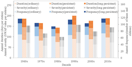 The drought events classified based on duration include ordinary, persistent, and long persistent drought events. Although the annual frequency of ordinary, persistent, and long persistent drought events in each decadal period decreased sharply in turn, the differences in duration and severity of the three drought events were less than that in frequency (Figure 6). Persistent and long persistent drought events occurred less frequently, but their impacts cannot be ignored.