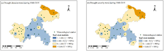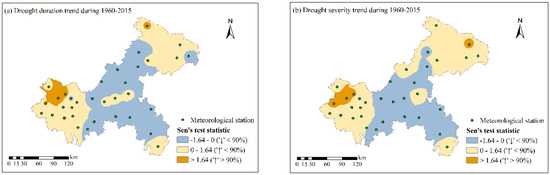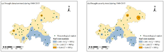 Spatial trend evolution of annual drought duration (a) and drought severity (b) of severe drought events from 1960 to 2015.