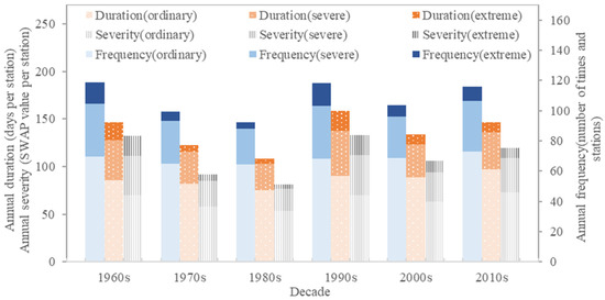 The drought events classified based on magnitude include ordinary, severe, and extreme drought events. The annual frequency of ordinary, severe, and extreme drought events in each decadal period decreased sharply in turn, similar to the duration and severity (Figure 9).