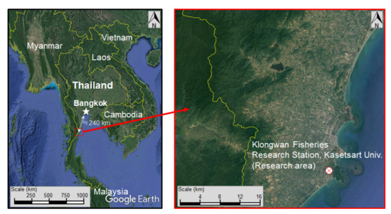 Continuous on-site observation was conducted at the experimental aquaculture ponds of the Kasetsart University Khlongwan fishery research station in Thailand (N 11°45′18′′, E 99°47′33′′; Figure 1). Three ponds of similar scale were prepared, in order to investigate the possible differences of halocline formation in different salinity conditions. Salinity conditions were set using seawater and tap water before starting the continuous observation. During the observation period, the salinity and water level were adjusted only once before starting the observation. Therefore, the variation of the salinity and water level depended on the weather conditions. Moreover, the monitoring was conducted without aquaculture products or an aeration system. Therefore, the outcomes of the present study should demonstrate the basic physical phenomena in saline ponds induced by halocline triggered by rainfall in the tropics.
