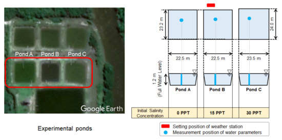 - Ozaki, A.; Kaewjantawee, P.; Anongponyoskul, M.; Thinh, N.V.; Matsumoto, M.; Harada, M.; Hamagami, K.; Okayasu, T. Heat storage induced by salinity stratification in tropical saline aquaculture ponds. In Proceedings of the 2019 ASABE Annual International Meeting 2019, Boston, MA, USA, 7–10 July 2019; Volume 2019, p. 01005. [Google Scholar]