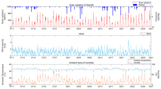 Weather variation time-series. Solar radiation, wind velocity, and air temperature are mean values over 1 h. Rainfall is an accumulated value over 1 h.