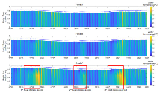 Regarding the tendency of water temperature variation in Pond C, in the 1st and 3rd periods, when the solar radiation was powerful after the continuous rainfall, high water temperatures were continuously observed in Pond C. In contrast, in the 2nd period, when the solar radiation was not intense after the continuous rainfall, the water temperature was not high compared to the other periods. In these three periods, a general daily water temperature cycle induced by solar heating in the day-time and radiative cooling at night-time was observed in Ponds A and B. On the other hand, in Pond C, the water temperature, except for in the surface layer, dramatically increased and seemed not to be affected by radiative cooling at night-time. The maximum water temperature recorded in each heat storage period in Pond C was 36.0 °C at 16:10 on 21 July in the 1st period, 32.8 °C at 18:30 on 7 August in the 2nd period, and 35.9 °C at 16:00 on 22 August in the 3rd period. All of the maximum values were observed at 0.5 m from the bottom. The water temperatures observed in Ponds A and B at the same time and height were as follows: 33.1 °C, 30.0 °C, and 34.3 °C in Pond A, and 32.9 °C, 30.7 °C, and 33.0 °C in Pond B, respectively.