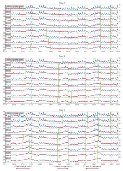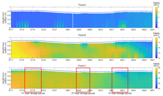 From Figure 4, it can be clearly seen that high water temperature, from the bottom to middle height, continued for several days in Pond C. This unique variation pattern of water temperature is defined in the present study as “heat storage” in a saline water pond. The heat storage phenomenon in Pond C occurred three times (1st period, 2nd period, and 3rd period, respectively), indicated by the red rectangle in Figure 4 and Figure 5. The definitions of these three periods are given in the following section. From Figure 3, continuous rainfall was observed before the appearance of heat storage in Pond C. This rainfall seemed to cool down and make the water temperature distribution uniform in Pond A. On the other hand, only the water temperature in the surface layer was impacted by the rainfall, while the water temperature in the middle and bottom layers was not impacted by rainfall in Ponds B and C. A similar tendency can be seen in Figure 5. Rainfall impacted the salinity distribution in the vertical direction in Ponds B and C, indicating that low-temperature, lightweight water due to rainfall was floating on the water surface, as salinity differences were formed in Ponds B and C. Incidentally, the salinity concentration in the middle to bottom layers of Pond A increased during several days and periods. This was considered to be due to seawater intrusion from the surrounding canals.