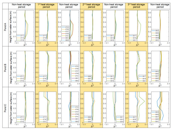 Figure 7 shows the vertical distribution of at midnight (AM 0:00), divided by each period. In Figure 7, the values near the water surface, which displayed a sensitive variation to weather conditions, were excluded. In pond A, positive values in the bottom to middle layers were observed on several days. This was due to seawater intrusion from the surrounding canals, as explained in the previous section. Except for these seawater intrusion days, the was almost zero from the bottom to the water surface in each period, indicating that the structure of density stratification was neutral, without vertical density differences. On the other hand, in Ponds B and C, the vertical distribution of had different characteristics between non-heat storage periods and heat storage periods. In non-heat storage periods, differences for vertical direction were slight and stable in both Ponds B and C, except for the immediate day at the end of heat storage. Therefore, the density stratification was neutral in both Ponds B and C. However, in heat storage periods, the stable value of was only from the bottom to 0.35 m, while the layer upward of 0.35 m had different variations in Ponds B and C. In Pond B, the value upward of 0.35 m had positive values without significant differences in the vertical direction, and shifted to a negative value or zero near the water surface. This indicated that the density structure during heat storage periods in Pond B consisted of two layers: a stable density layer with constant salinity concentration from bottom to 0.35 m and a density gradient layer from 0.35 m to the surface. In pond C, the value upward of 0.35 m had a positive peak value at 0.45 m and a constant value from 0.55 m to the surface. These indicated that the density structure during heat storage periods in Pond C was comprised of three layers: a stable density layer with constant salinity from the bottom to 0.35 m, a halocline with high gradient from 0.4 m to 0.5 m, and a density gradient layer with low salinity from 0.5 m to the water surface.