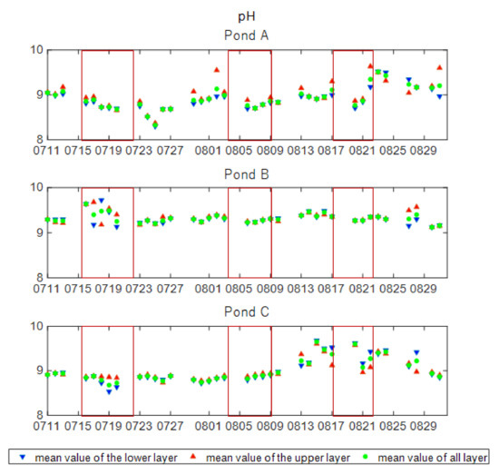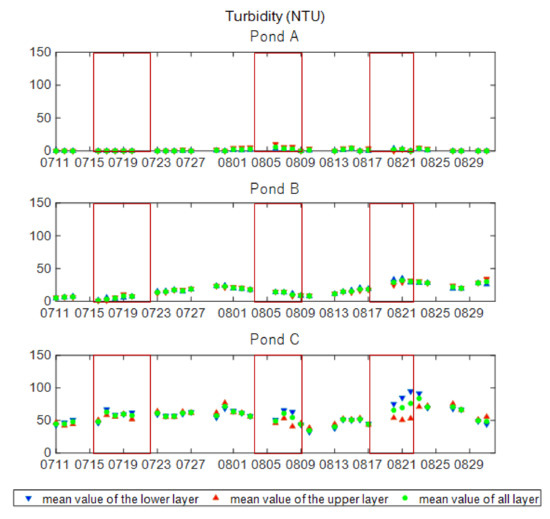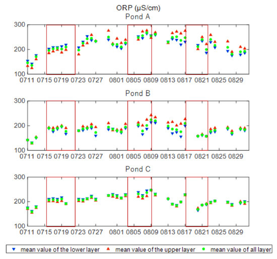 Figure 8, Figure 9, Figure 10 and Figure 11 show the mean of DO, pH, Turbidity, and ORP variation in the lower layer (blue inverted triangle), the upper layer (red triangle), and all layers (green circle), respectively. The red rectangles indicate the heat storage period in Pond C. In the observation ponds, DO variation was affected by O2 consumption due to the respiration of micro-organisms, and O2 production by photosynthetic phytoplankton or supplemented by reaeration at the water surface. pH variation was mainly impacted by the biological and chemical reactions that release or consume CO2. The main component of turbidity could be micro-organisms inside the ponds and suspended solids inflowed by rainfall. ORP was affected by the aerobic or anaerobic state of the water.