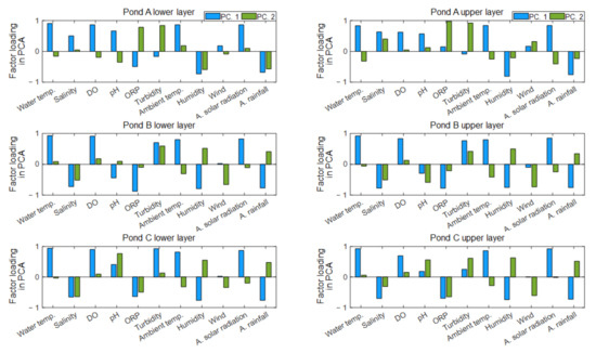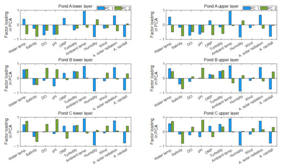 From Figure 13, for the heat storage period, the dominant parameters in PC 1 were not only weather parameters, but also water quality parameters. Moreover, the factor loading for water temperature in PC 1 was high in each pond and period, such that the variation of water temperature contributed to the variation of water quality parameters. The other high values of factor loadings associated with water quality in PC 1 differed among the ponds. In Ponds A and B, the high factor loading values were DO and pH in Pond A, as well as DO and turbidity in Pond B, while differences in layers could not be found in both ponds. On the other hand, in Pond C, a difference between layers was observed. The high factor loading values associated with water quality in Pond C were DO and turbidity in the lower layer, but only DO in the upper layer. This indicated that DO and turbidity in the lower layer of Pond C, which had heat storage, could increase with the water temperature.